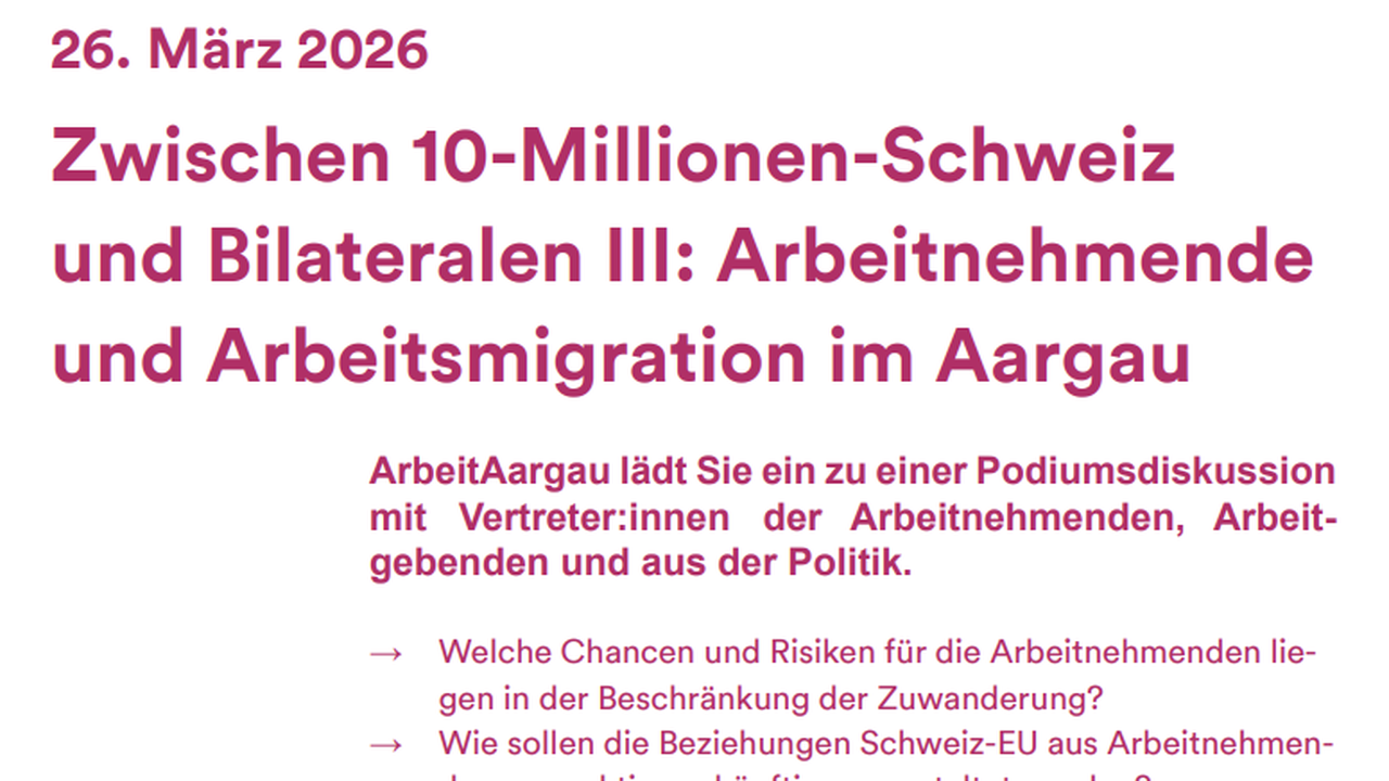 ArbeitAargau lädt Sie ein zu einer Podiumsdiskussion mit Vertreter:innen der Arbeitnehmenden, Arbeitgebenden und aus der Politik.